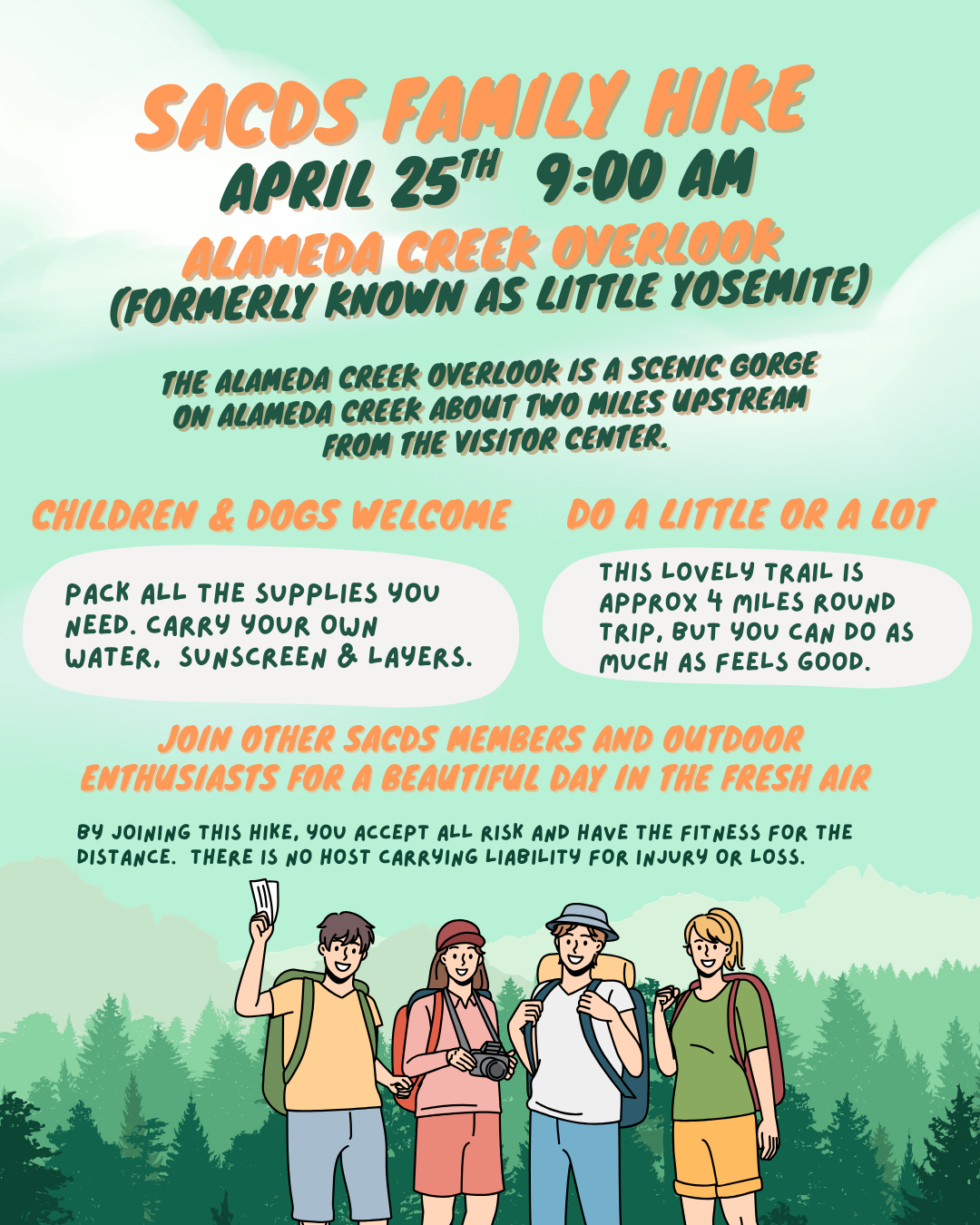 SACDS Family Hike April 25, 2026 9:00 AM - 12:00 PM Location: Sunol Regional Wilderness Address: 405 Boulder Ct Suite 600, Pleasanton, CA Directions Email: info@sacds.org Phone: Do you have any questions? Please call our office at: (510) 782-5316. Add to: Outlook ICal Google Calendar